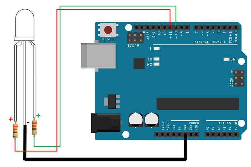 Realizaremos la siguiente conexión del led RGB de 3mm o 5mm a nuestra tarjeta de desarrollo R3, no sin antes, colocar resistencias entre el led y la tarjeta.