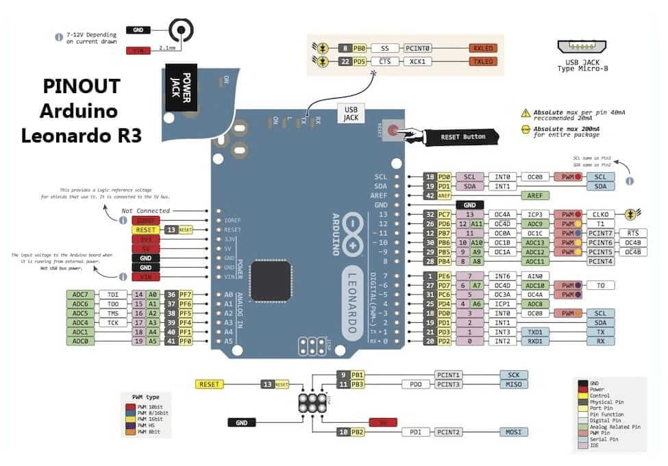 El Leonardo R3 MEGA32U4 compatible con Arduino es una placa de desarrollo , posee 20 pines de entrada y salida digitales (de los cuales 7 pueden ser usados como salidas PWM y 12 como entradas análogas), un cristal oscilador de 16 MHz, una conexión micro USB, un Jack de alimentación, un header ICSP y un botón de reinicio.