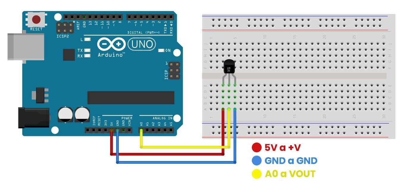 Conectar el sensor LM35 a la placa Arduino UNO, solo tienes que conectar el pin de VOUT a un pin analógico y alimentarlo con los 5 V que proporciona la placa de Arduino y por último conectar la terminal (-) a GND. En la siguiente imagen se muestra como realizar las conexiones entre el sensor y Arduino UNO: