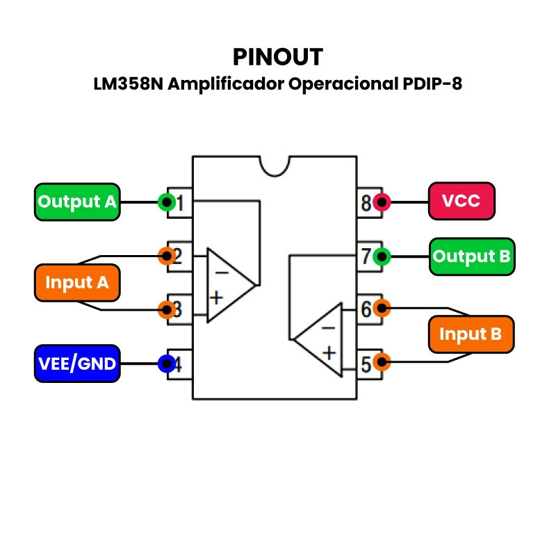 El amplificador LM358N es un circuito integrado (CI) de 8 pines que internamente está construido por dos amplificadores operacionales independientes de alta ganancia con compensación de frecuencia interna, diseñado específicamente para operar mediante una única fuente de alimentación en un amplio rango de voltaje. También es posible su funcionamiento a partir de fuentes de alimentación divididas y la poca pérdida de corriente de alimentación es independiente de la magnitud del voltaje de alimentación.