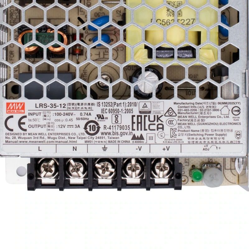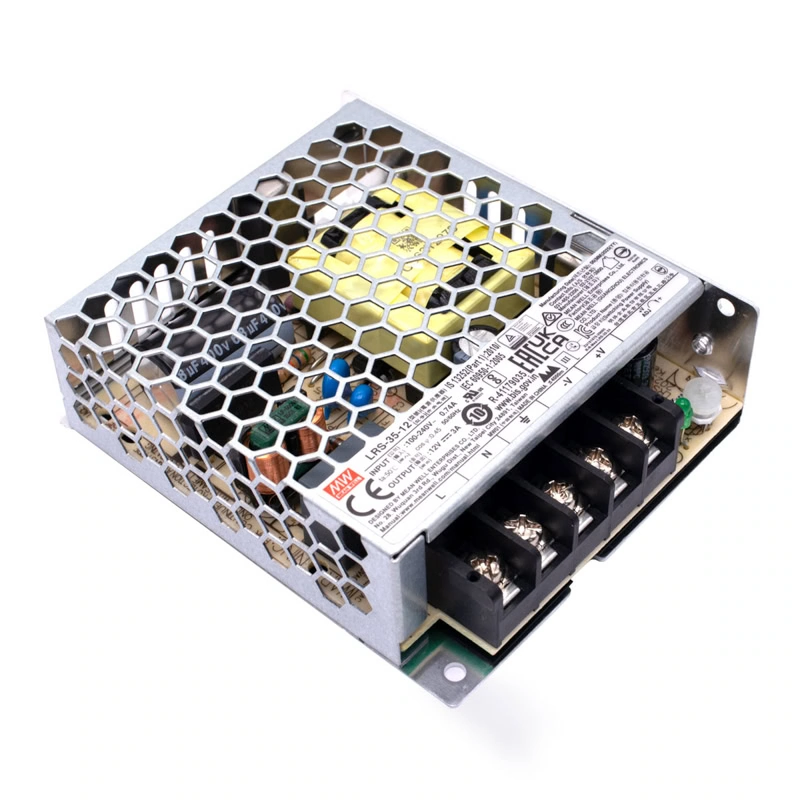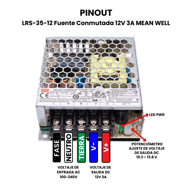 La LRS-35-12 es una fuente conmutada de 12 V y 3 A (36 W) de la marca MEAN WELL, diseñada para transformar la energía de la red eléctrica (100–240 V AC) en un voltaje estable de 12 V DC. Su carcasa metálica ventilada permite una buena disipación de calor sin necesidad de ventilador, lo que la hace compacta y silenciosa para uso continuo.