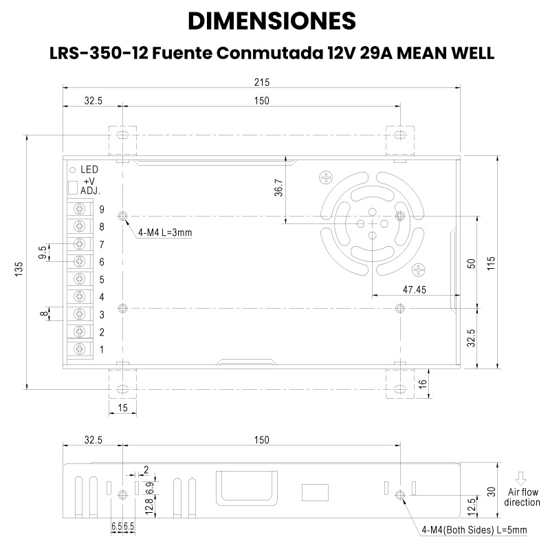 La LRS-350-12 de MEAN WELL es una fuente de alimentación conmutada de salida única que convierte corriente alterna en 12 V DC con una capacidad de hasta 29 A, diseñada para aplicaciones que requieren alta potencia en un formato compacto de perfil bajo (1U). Utiliza entrada seleccionable 115/230 V AC, e incorpora un ventilador interno con control automático ON/OFF que permite mantener la temperatura de operación dentro del rango incluso a carga elevada, facilitando su integración en gabinetes y equipos industriales.