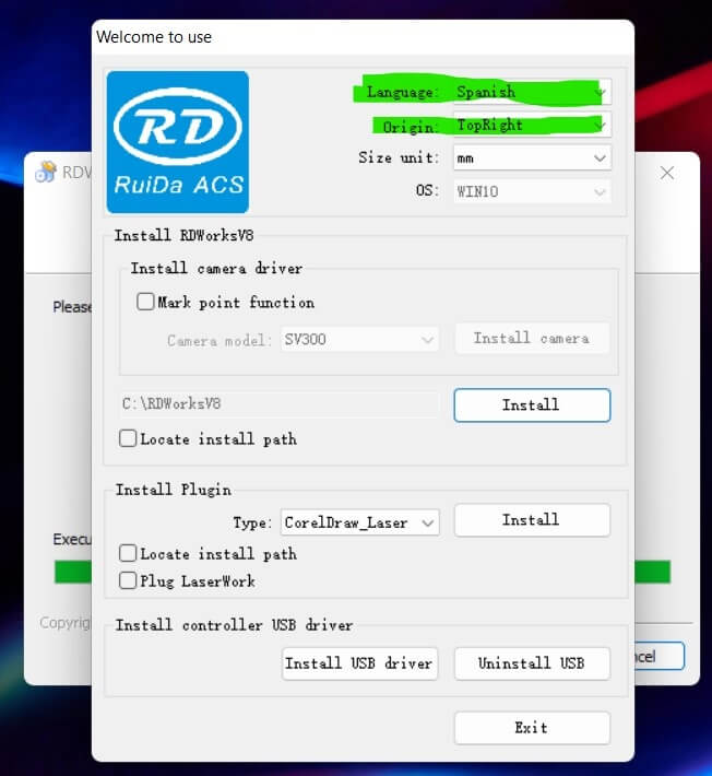 - Tener instalado el Software RDWorksV8 Durante la instalación saldrá la siguiente ventana asegúrate de seleccionar lo siguiente: