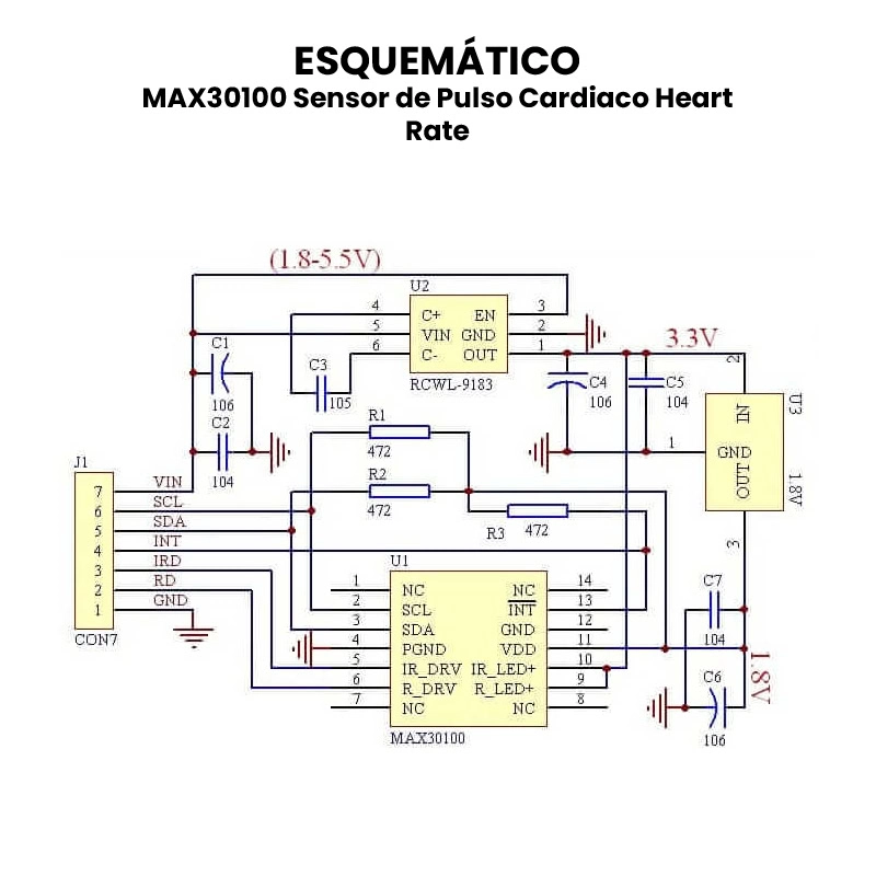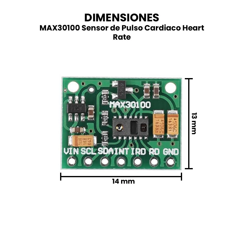 El sensor MAX30100 es ideal para proyectos relacionados con la monitorización de la salud, dispositivos de fitness, wearables, y aplicaciones médicas portátiles. Su diseño compacto y su bajo consumo de energía lo hacen adecuado para dispositivos que requieren mediciones continuas y no invasivas. El MAX30100 se comunica mediante I2C, lo que lo hace compatible con una amplia gama de tarjetas de desarrollo, como Arduino UNO, Nano, Mega, así como ESP8266, ESP32, STM32 y Raspberry Pi.
