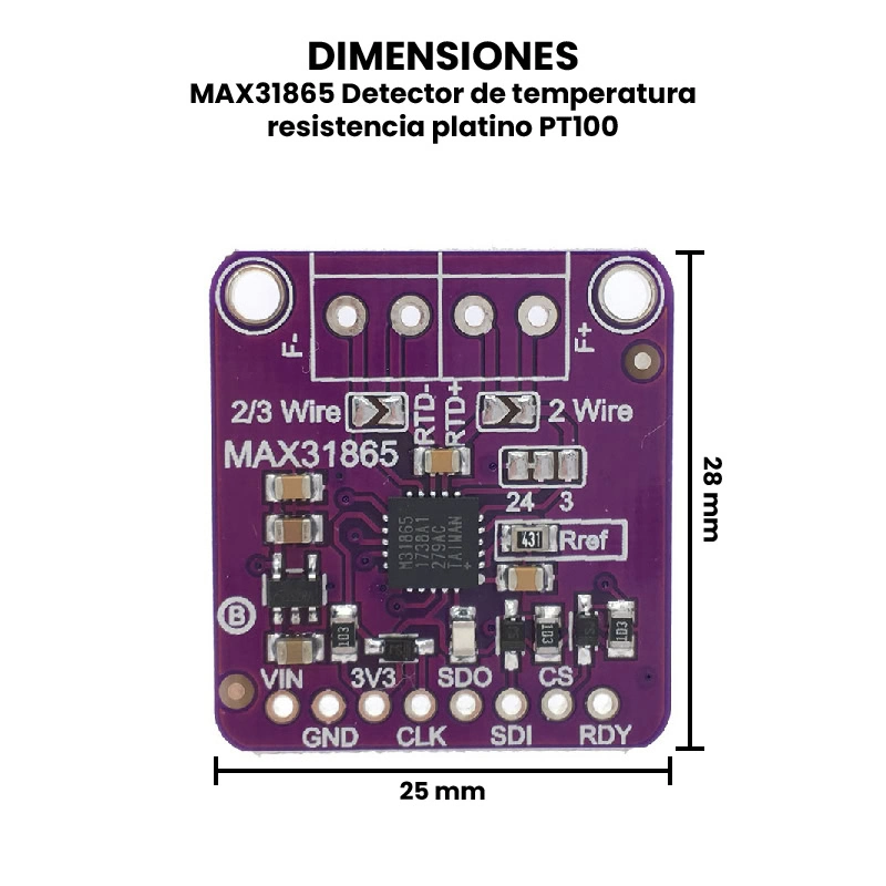 El MAX31865 es un convertidor analógico a digital especializado diseñado para trabajar con sensores de temperatura de resistencia de platino del tipo PT100 o PT1000, que son sensores RTD (Resistance Temperature Detector). Su función principal es traducir la variación de resistencia del sensor, causada por los cambios de temperatura, en una señal digital que puede ser interpretada fácilmente por microcontroladores. Este módulo integra un amplificador de precisión, un filtro de paso bajo y un convertidor ADC de 15 bits, ofreciendo lecturas precisas y estables. El MAX31865 funciona midiendo la resistencia del sensor PT100/PT1000 mediante un puente de Wheatstone interno y aplicando una corriente constante, compensando errores por auto-calentamiento. Además, permite configurar el tipo de conexión del RTD: de 2, 3 o 4 hilos, lo cual mejora la precisión al minimizar los errores causados por la resistencia de los cables. Se comunica mediante el protocolo SPI.