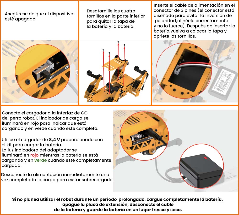 - Antes de encender el dispositivo, coloque al perro robot en posición boca abajo sobre una superficie plana para evitar daños por movimientos repentinos del servo.