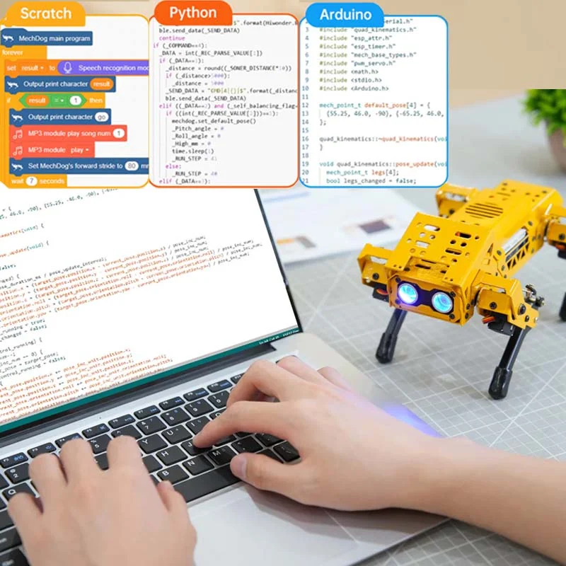 El MechDog Standar Kit podrás controlarlo a través de tu celular por medio de una aplicación y poder usarlo como evasor y detección de obstáculos por ultrasonido o que pueda realizar diferentes poses, por mencionar sus funciones principales, ya que podrás adecuarlo a tu manera realizando programas en los entornos: Python, Scratch y Arduino. Incluye amplios recursos de aprendizaje y desarrollo para que te embarques fácilmente en el desarrollo de tu perro robot.