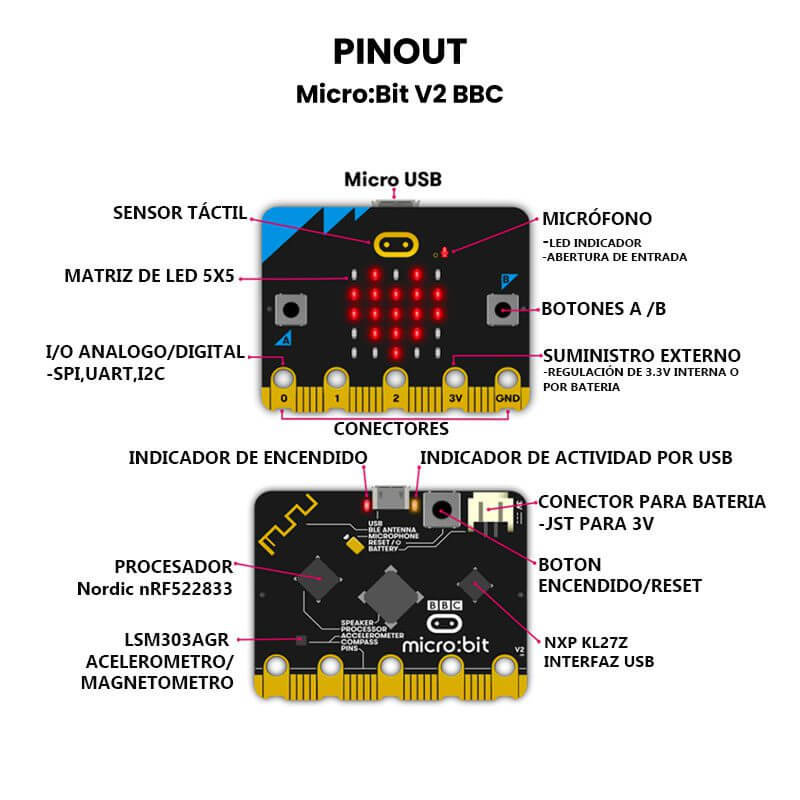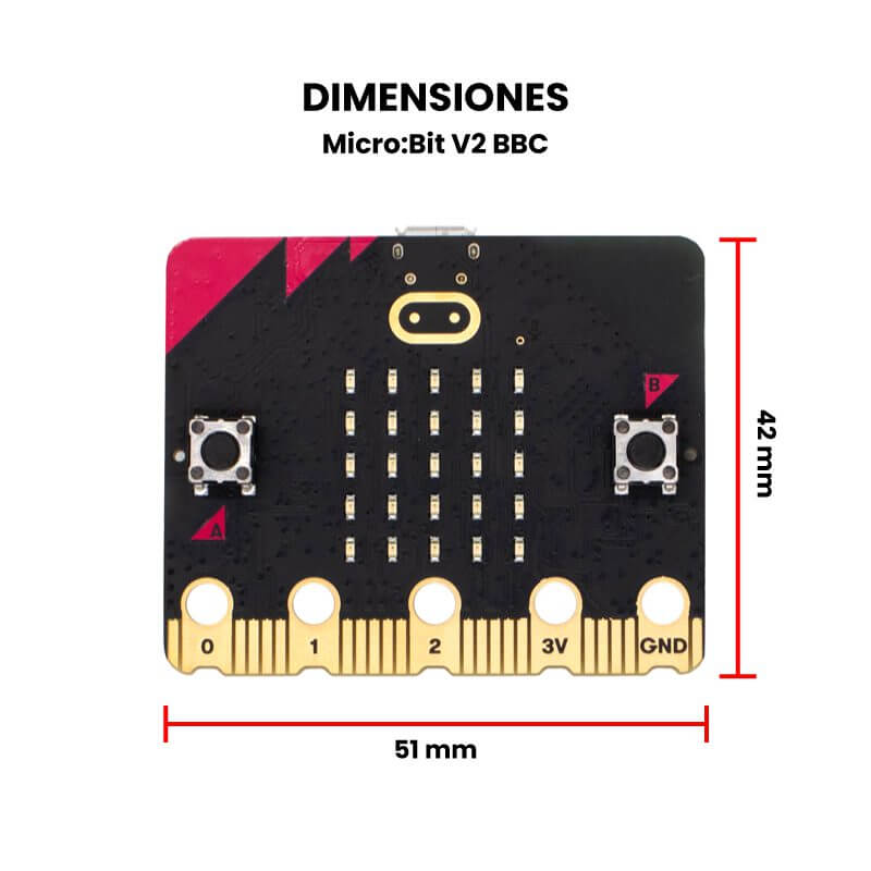 Micro:bit V2 es un micro ordenador de la mitad del tamaño de una tarjeta de crédito, está equipado con una matiz de leds de 5×5, dos botones programables, acelerómetro, brújula electrónica, termómetro, bluetooth, un nuevo logo sensible al tacto, micrófono, speaker y otros módulos electrónicos.
