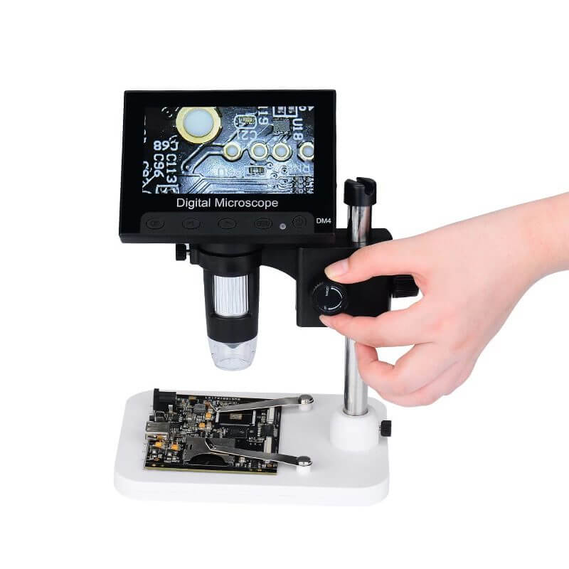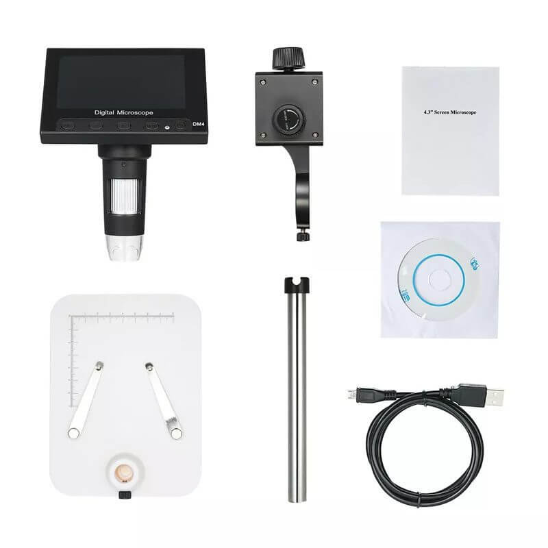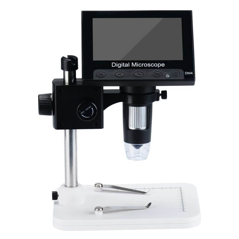 Microscopio Digital 1000X DM4 es un dispositivo óptico HD te ayudará a realizar inspecciones precisas en tiempo real, podrás ajustar el enfoque desde 50x a 1000x, esto permitirá ver detalles muy pequeños también tiene una base con soporte la cual permite colocar, subir y bajar el microscopio, este microscopio es de fácil utilización, tienen una una pantalla de 4.3 pulgadas para ver al instante, mostrado en alta calidad, de igual manera permite capturar imágenes y videos en HD de hasta 30 fotogramas por segundo, estas imágenes y videos se pueden guardar en una memoria MicroSD externa que puedes ingresar en la ranura de TF del microscopio, esta memoria no viene incluida en el producto.