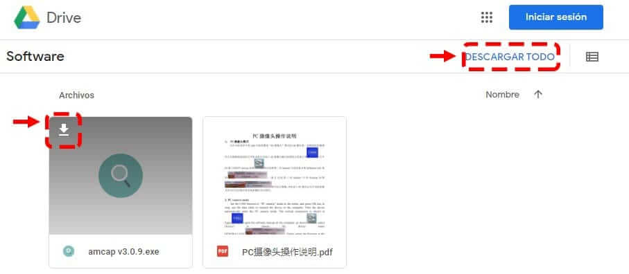 1. El primer paso será descargar el Software, sólo da clic en: Amcap V3.0.9 se abrirá un enlace de drive el cual contienen el programa y un manual que explica cómo iniciar el microscopio, en la siguiente imagen se definen las dos formas de descargar el programa, podrás descargar únicamente el programa o descargar todo esto lo bajara en formato .ZIP que tendrás que descomprimir.