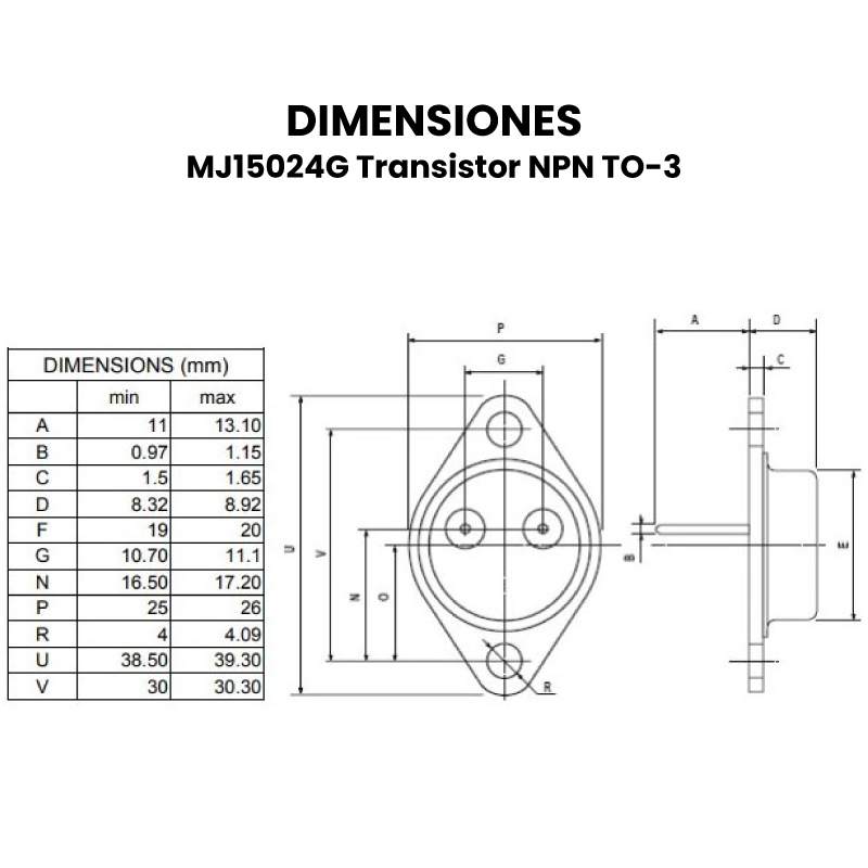 El MJ15024G es un transistor NPN de potencia con encapsulado TO-3, su utilidad principal radica en aplicaciones que requieren amplificación y conmutación de potencia. Gracias a su robustez y capacidad para manejar voltajes y corrientes, se utiliza en amplificadores de potencia, fuentes de alimentación, reguladores de voltaje y sistemas de control de motores. El encapsulado TO-3 proporciona una eficiente disipación de calor, fundamental para mantener la temperatura dentro de límites seguros durante su funcionamiento.