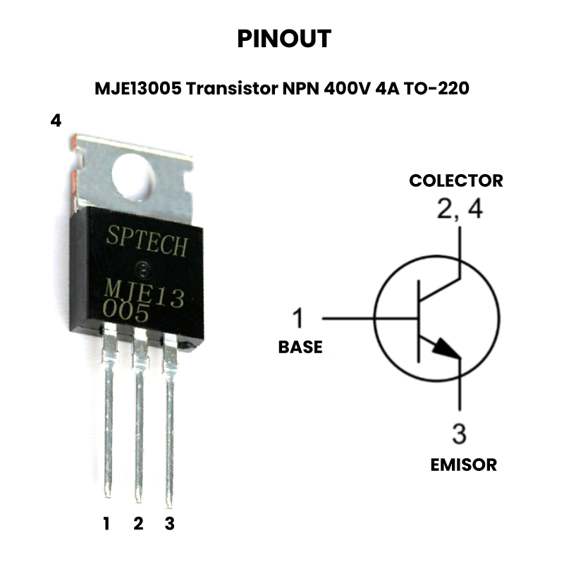 El MJE13005 es un transistor NPN de potencia diseñado para aplicaciones de conmutación y amplificación de alta potencia soporta un voltaje de colector-emisor 400V y una corriente continua de 4A. La encapsulación TO-220 facilita su montaje en circuitos y disipación de calor.