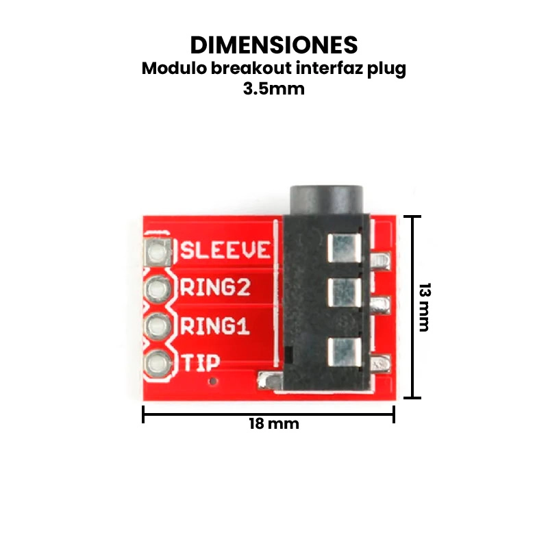 El módulo breakout con interfaz Jack 3.5mm es una pequeña placa diseñada para facilitar la conexión de dispositivos de audio mediante un conector estándar de 3.5 milímetros (TRS o TRRS). Este módulo expone cada uno de los terminales del conector (tip, ring y sleeve) a pines de fácil acceso, lo que permite integrarlo rápidamente en proyectos electrónicos. Su funcionamiento consiste en recibir o enviar señales analógicas de audio, ya sea para entrada (como micrófonos) o salida (como auriculares o altavoces), según el diseño del circuito.