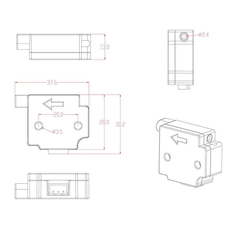 El Módulo de Detección de Rotura de Filamento de Impresora 3D, también es llamado como sensor de fin de filamento, es ideal para detectar cuándo se ha terminado el filamento o cuando tenga una ruptura el filamento durante la impresión permitiendo pausar la impresora 3D para cargar nuevamente el filamento y continuar imprimiendo. Este módulo tiene una entrada y salida de material de tipo embudo, está diseñado únicamente para filamento con diámetro de 1.75mm, el módulo incorpora una flecha en su carcasa que indica cómo ingresar el filamento y además incluye cable de alimentación y señal con longitud de 1m para conectar el módulo a la tarjeta de control de la impresora.