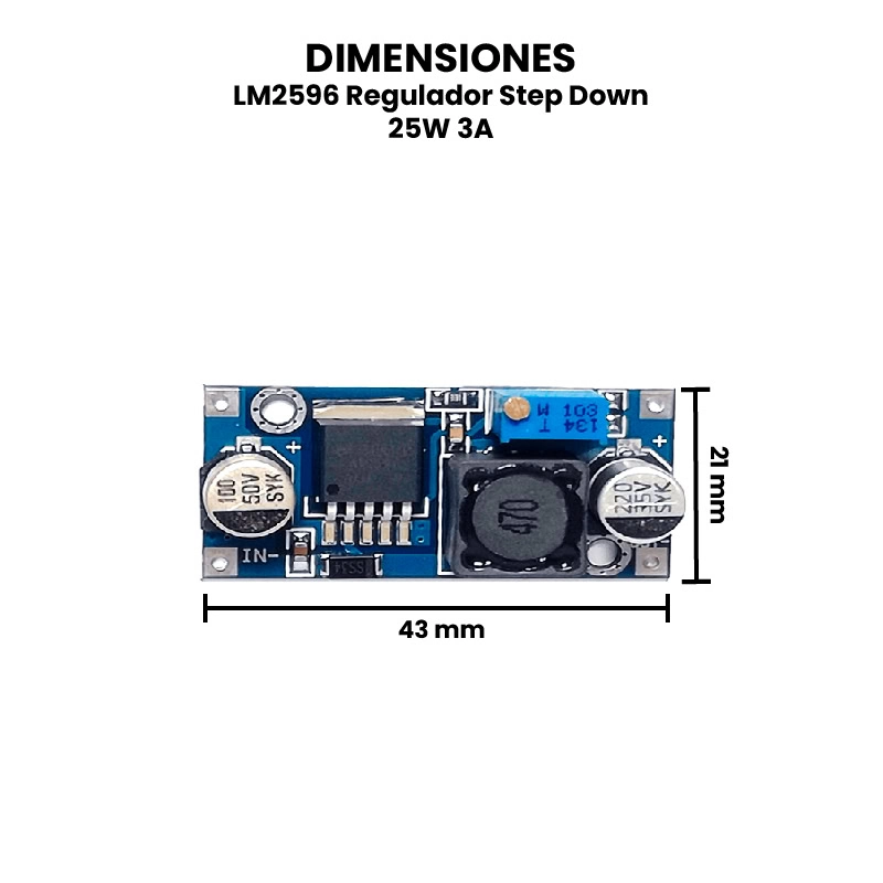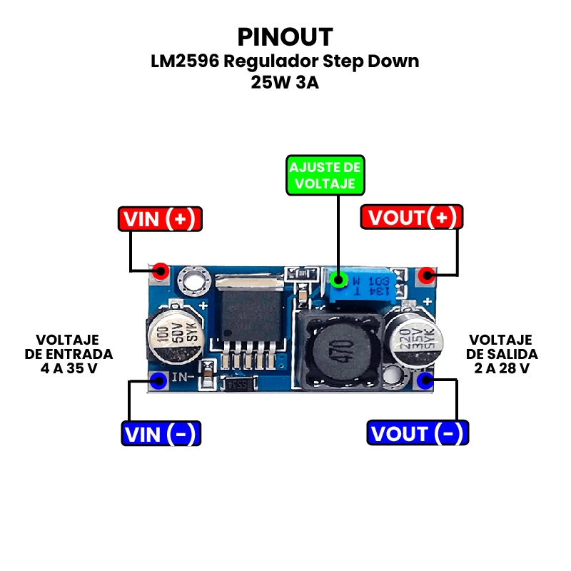 El LM2596 es un módulo regulador de voltaje Step-Down (reductor) capaz de convertir una entrada de voltaje superior (entre 4 V y 35 V) a un voltaje de salida inferior y estable, ajustable entre 2 V y 30 V. Este módulo puede manejar corrientes de salida de hasta 3 amperios y ofrece una potencia de hasta 25 W, lo que lo convierte en una solución eficiente para alimentar circuitos electrónicos sensibles a sobrevoltajes. Gracias a su alta eficiencia (superior al 80 % en la mayoría de los casos).