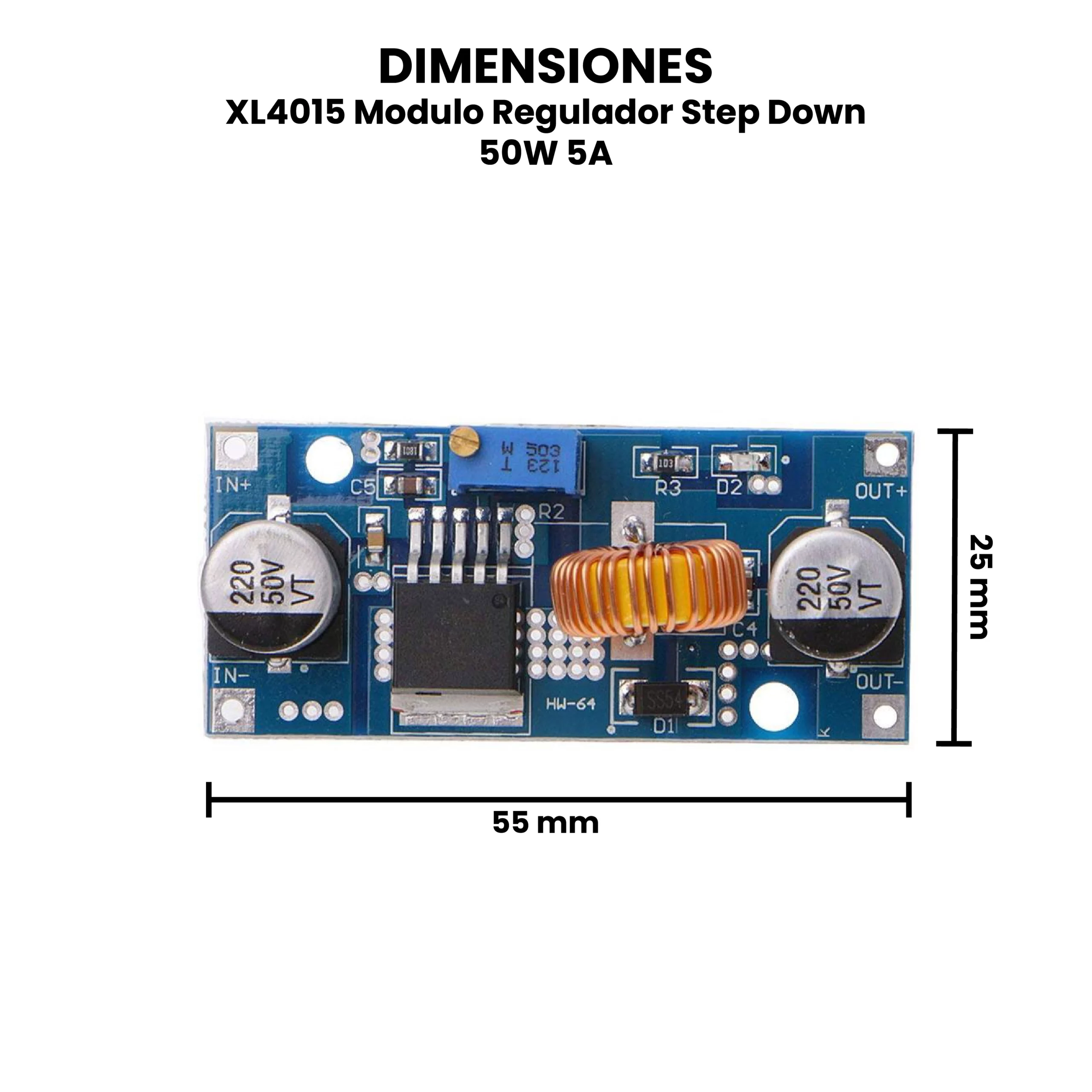 El XL4015 Módulo Regulador Step Down 50W 5A es un convertidor DC-DC reductor de voltaje diseñado para disminuir un voltaje de entrada mayor a uno menor y estable con alta eficiencia. El usuario puede regular el voltaje mediante un potenciómetro, permitiendo alimentar distintos dispositivos electrónicos de forma segura y eficiente, con un rango de voltaje de 1.25 a 32 VDC en su salida, para ello debe ser alimentado con 4 a 36 VDC.