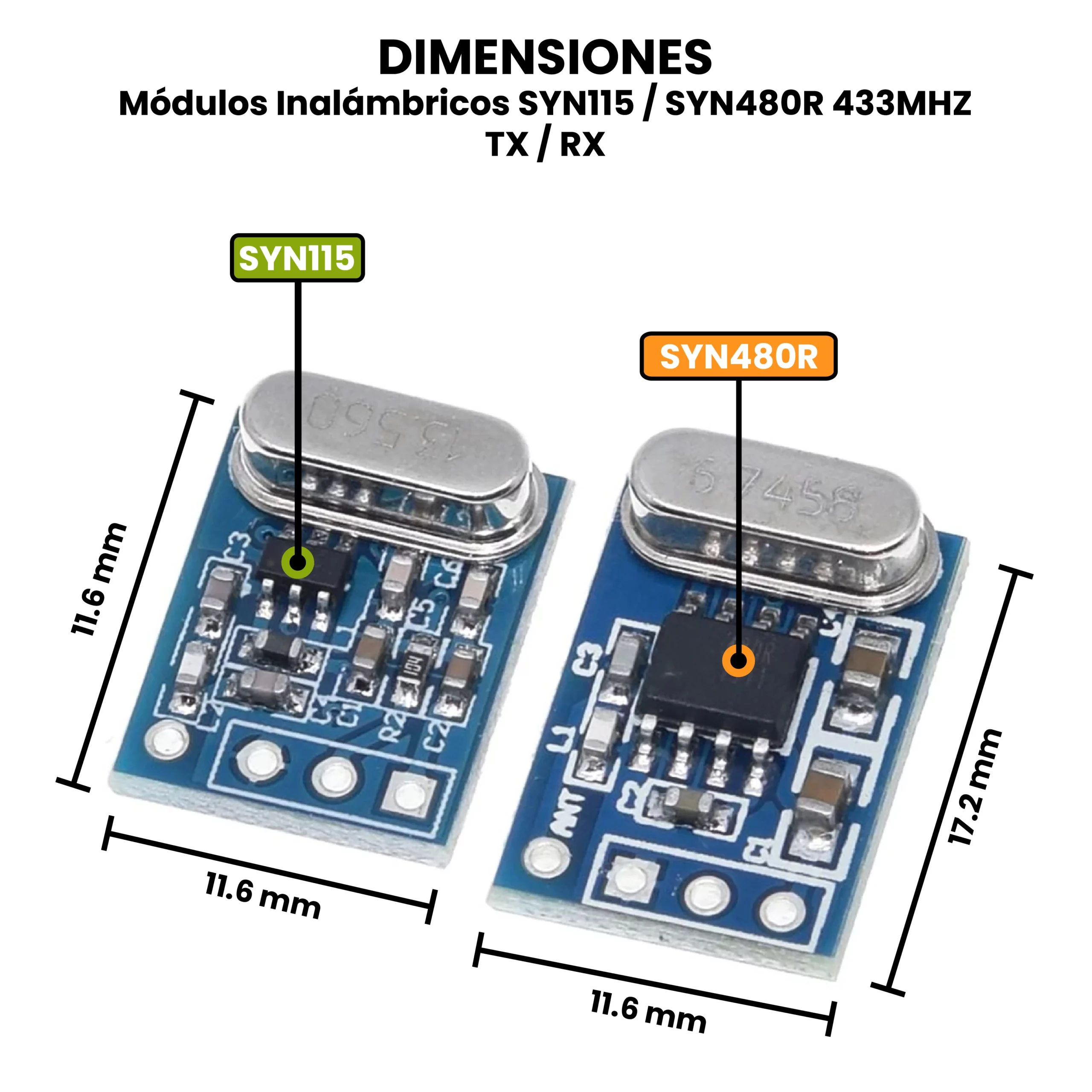 Los Módulos Inalámbricos SYN115 / SYN480R 433 MHz TX / RX son un conjunto de dispositivos diseñados para transmitir y recibir datos de forma inalámbrica mediante radiofrecuencia en la banda de 433 MHz. El SYN115 funciona como transmisor (TX), encargado de enviar señales digitales desde un microcontrolador u otro circuito, convirtiéndolas en ondas de radio. Por otro lado, el SYN480R actúa como receptor (RX), captando esas ondas de radio y reconvirtiéndolas nuevamente en señales digitales que pueden ser interpretadas por otro dispositivo electrónico.
