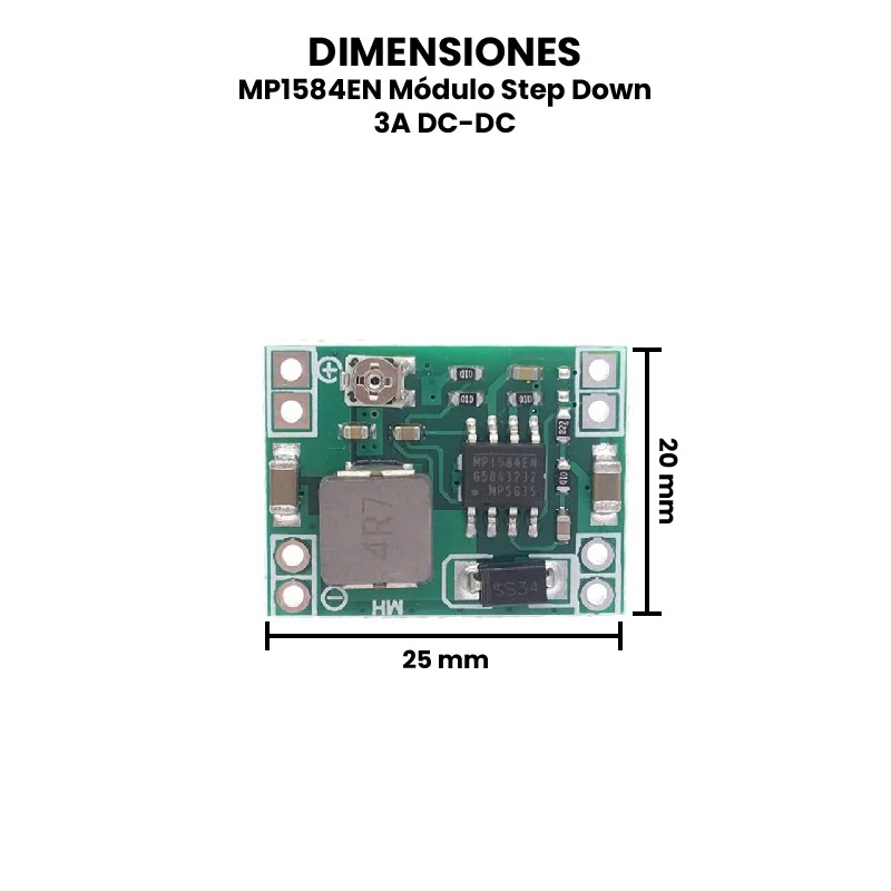 El MP1584EN Módulo Step Down 3A DC-DC, también llamado Buck es un dispositivo electrónico de conmutación descendente de alta frecuencia, permitiendo convertir voltaje de entrada de 4.5 V a 28 V a 0.8 V a 20 V. Siendo capaz de soportar hasta 3 A de regulación.