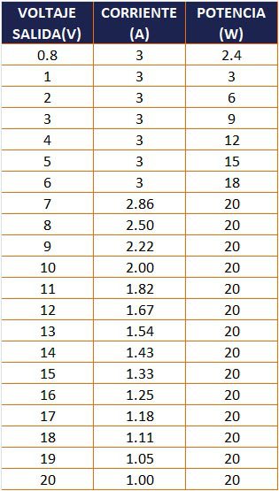 - Voltaje de salida: 0.8 a 20 VDC (Ajustable Salida < Entrada).
