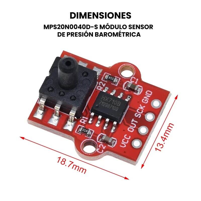 El elemento principal del módulo es un sensor MPS20N0040D-S el cual convierte las mediciones de presión en señales analógicas y se puede conectar a una manguera de 2.5mm de diámetro (No incluida). También contiene un circuito integrado HX710B que es un convertidor analógico-digital (ADC) de alta precisión, 24 bits y con sensor de temperatura interno.