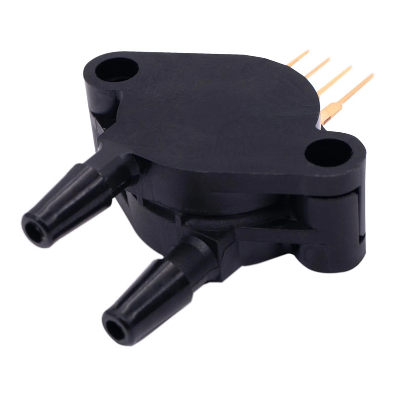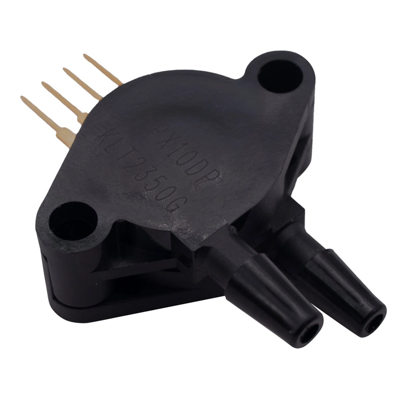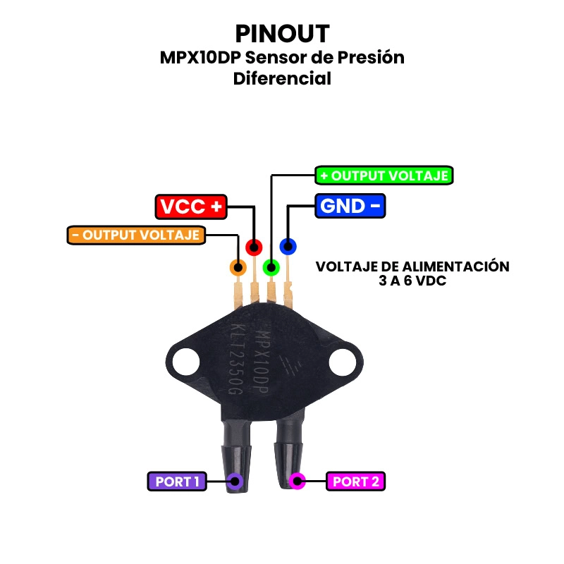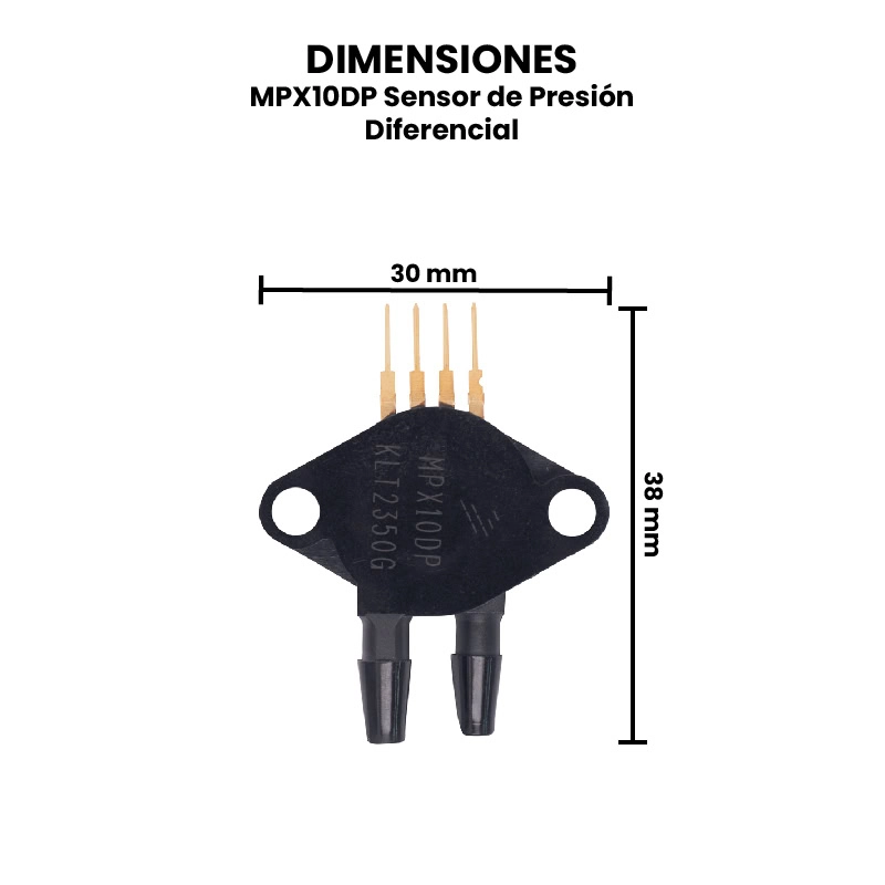El MPX10DP es un sensor de presión diferencial analógico diseñado para medir pequeñas diferencias de presión entre dos entradas, comúnmente en el rango de 0 a 10 kPa (kilopascales). Su principio de funcionamiento se basa en un puente de Wheatstone integrado en una membrana de silicio que se deforma ligeramente al aplicarse presión, generando una salida de voltaje proporcional a la diferencia de presión entre sus dos puertos. Este sensor es altamente sensible y proporciona una señal analógica de bajo nivel que puede ser amplificada y leída por un microcontrolador.