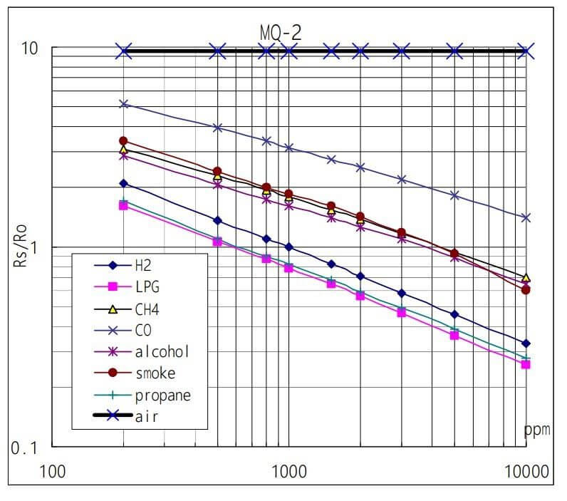 Los módulos MQ son sensibles a más de un gas y en diferente proporción a cada uno, por lo que si el objetivo eso obtener los valores en unidades correspondientes a la concentración del gas medido es necesario hacer un proceso de escalado mediante software a partir de la curva característica de sensibilidad (disponible en la hoja de datos)
