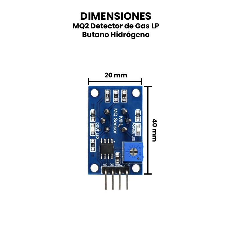 El MQ2 Detector de Gas LP Butano Hidrógeno, es un sensor electro-químico que varía su resistencia al estar contacto con gases inflamables especialmente LP, propano, hidrógeno, metano e incluso humo en general, el módulo contiene un circuito electrónico que funciona como interfaz además cuenta con una salida analógica y otra digital.