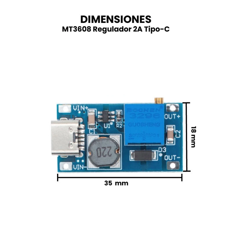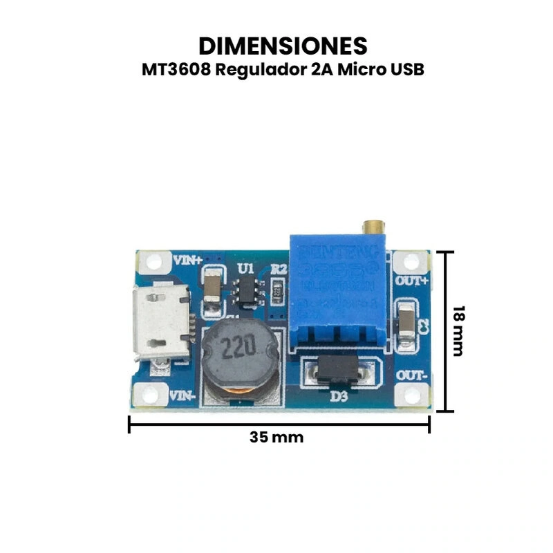 El regulador MT3608 es un dispositivo electrónico que permite la regulación o conversión de voltaje de corriente directa “DC” a otro voltaje “DC” con una alta eficiencia de conversión, puede tomar voltajes de entrada tan bajos como 2V y aumentar la salida hasta 28V. Puede suministrar voltaje a través del puerto Tipo C o Micro USB.