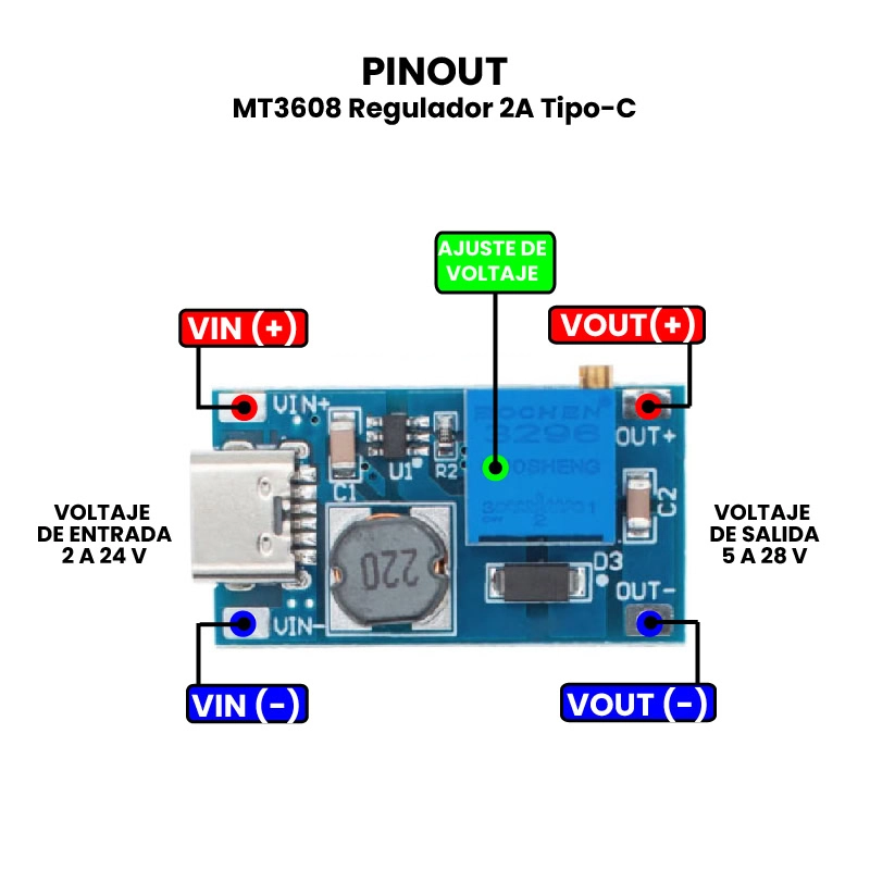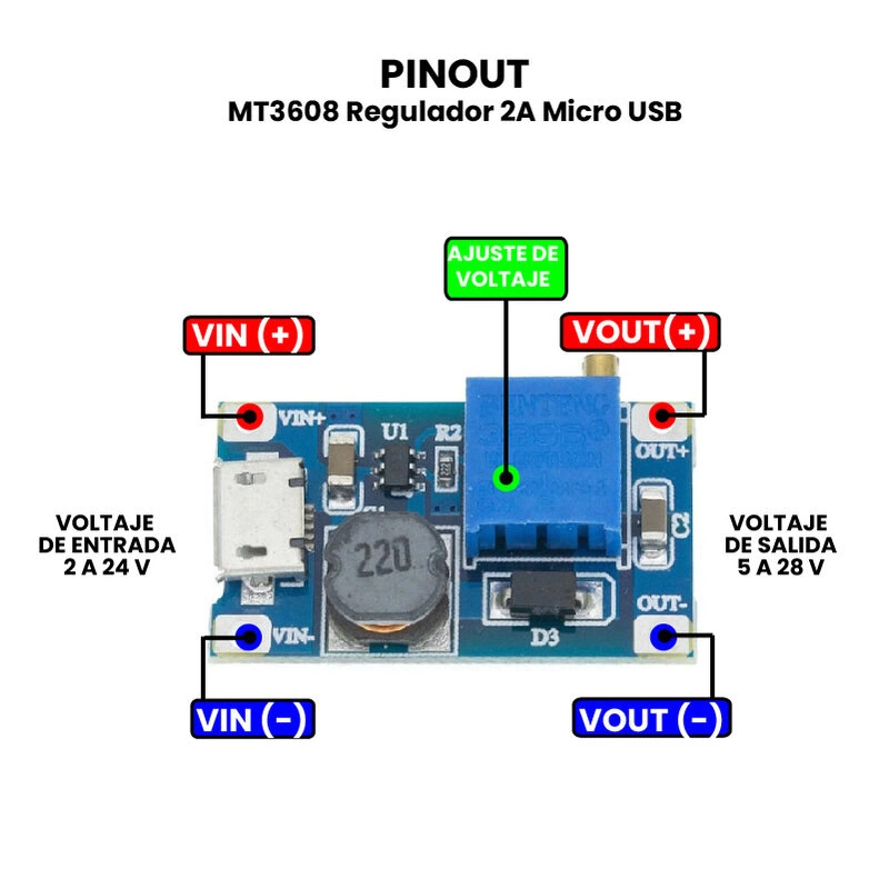 - Salida: 5V a 28V DC (Regulable por trimmer).