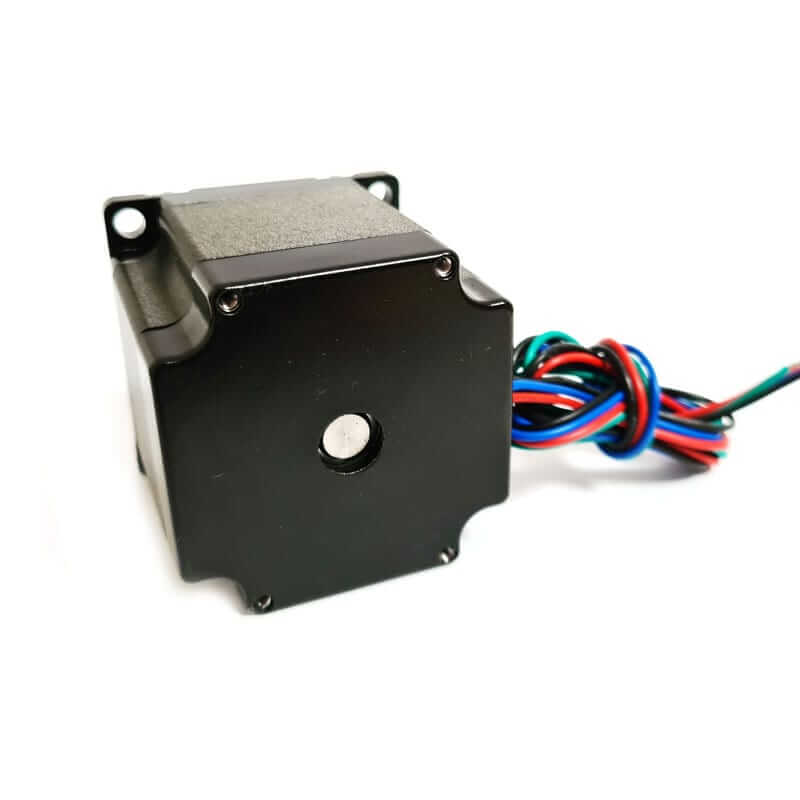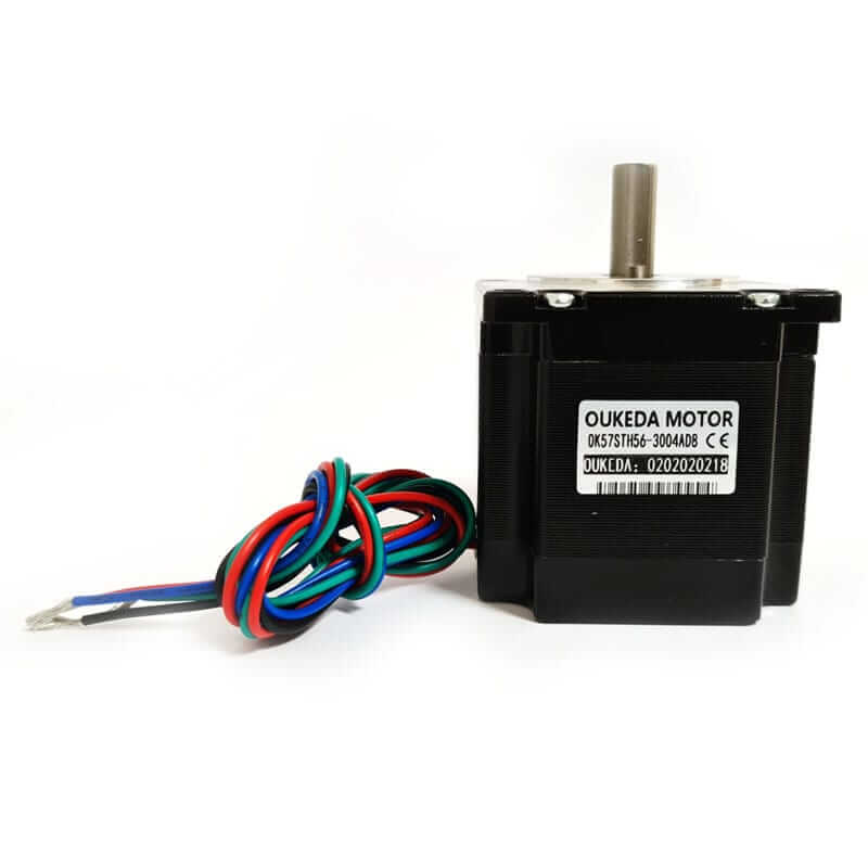 El Nema 23 57BYGH56 es un motor paso a paso de tipo bipolar híbrido de alto torque que tiene un ángulo de paso de 1.8 ° (200 pasos / revolución) donde cada fase consume 3 A, con un torque de 1.2 Nm. El motor tiene cuatro cables codificados por colores negro, verde, rojo, y azul para conectar las bobinas a las terminales de controlador.