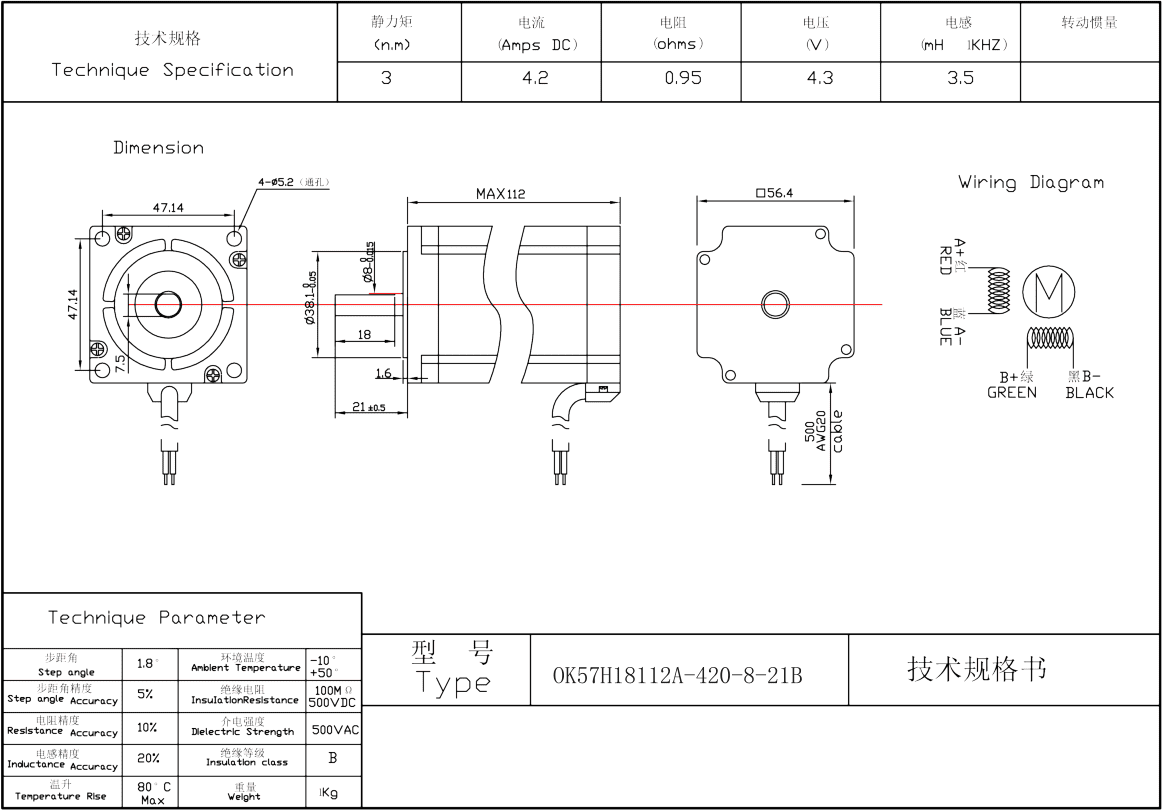 Motor paso a paso Nema 23 OK57H18112A de tipo bipolar híbrido de alto torque tiene un ángulo de paso de 1.8 ° (200 pasos / revolución). Cada fase consume 4.2 A, con un torque de 3 Nm. El motor tiene cuatro cables codificados por colores amarillo, verde, rojo, y azul para conectar las bobinas a las terminales de controlador.
