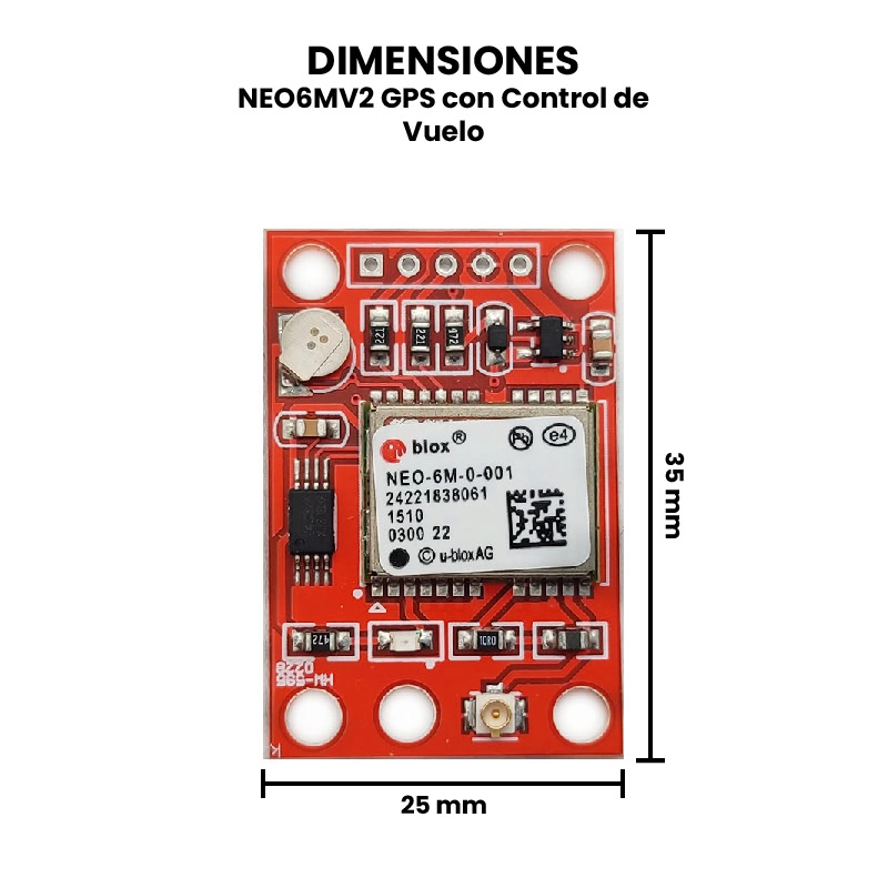 El NEO-6M V2 GPS con control de vuelo es un módulo de posicionamiento global basado en el chip u-blox NEO-6M, diseñado para recibir señales de satélites GPS y calcular con alta precisión la ubicación, velocidad y tiempo en tiempo real. Funciona mediante la recepción simultánea de datos de múltiples satélites, que son procesados internamente para determinar coordenadas geográficas y otros parámetros de navegación. Este módulo integra una antena cerámica para una mejor captación de señal, memoria EEPROM para guardar configuraciones y una interfaz serial UART que permite la comunicación directa con tarjetas de desarrollo o controladoras de vuelo.