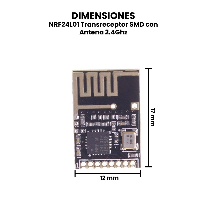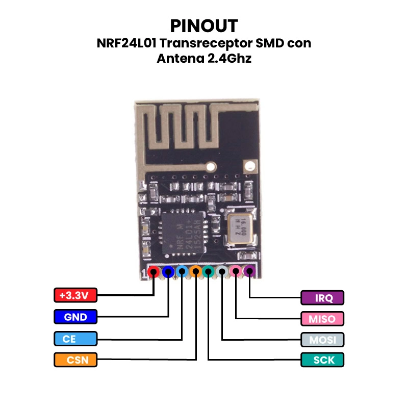 El NRF24L01 Transreceptor SMD con Antena 2.4 GHz es un módulo de comunicación inalámbrica de bajo consumo basado en el chip NRF24L01+ de Nordic Semiconductor, diseñado para transmitir y recibir datos mediante radiofrecuencia en la banda ISM de 2.4 GHz. Este módulo permite establecer una comunicación bidireccional entre microcontroladores, ideal para redes inalámbricas punto a punto o en malla. Su funcionamiento se basa en la transmisión digital por paquetes, con una velocidad de hasta 2 Mbps y un alcance que puede superar los 100 metros en campo abierto gracias a su antena integrada.