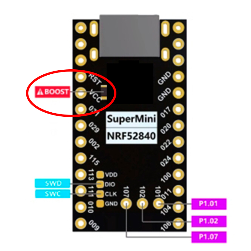 Si se requiere de una alimentación externa solo debes conectar el polo positivo de la batería al pin B+ y el polo negativo al pin B-. La alimentación externa solo admite 3.7V y la velocidad de carga es 100mA. Si sueldas estos pines recuerda revisar cuidadosamente que no se haya generado un corto circuito entre ambos pines, ya que esto puede causar daños a tu placa.