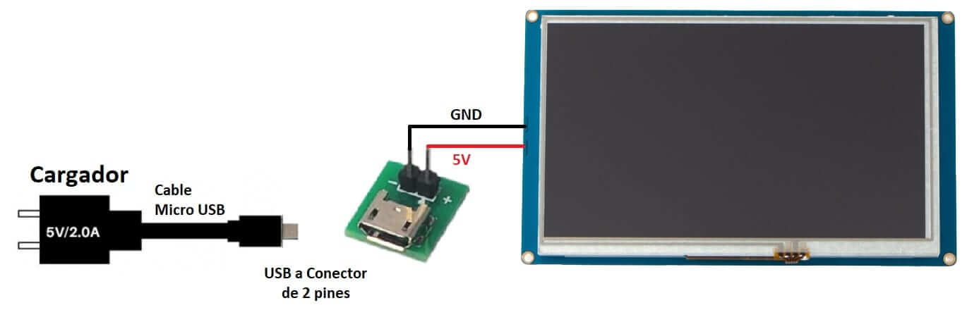 Como se muestra puede realizar una conexión rápida para comprobar que la pantalla Nextion tenga una correcta alimentación de energía.