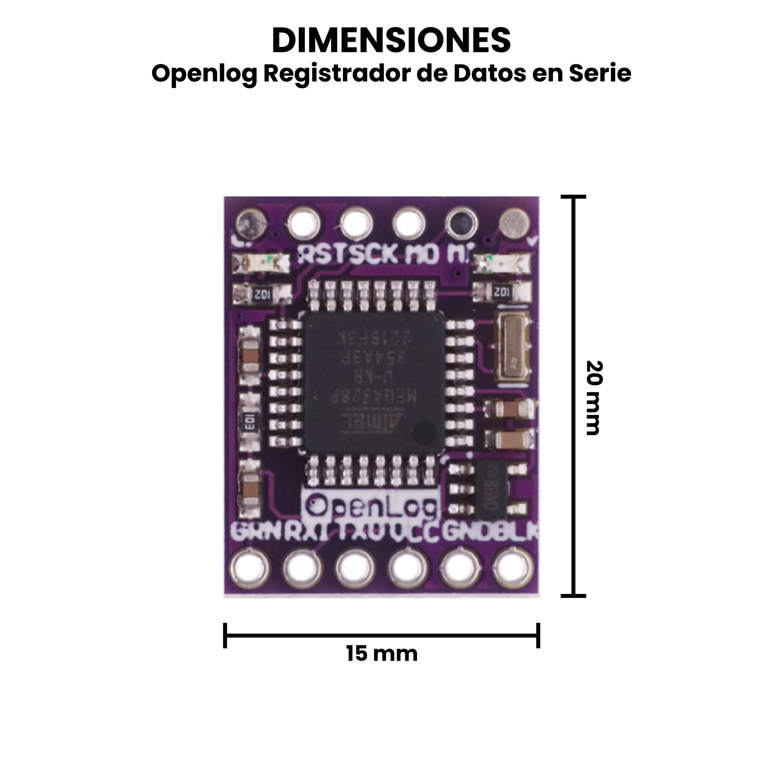 - Dimensiones: 15 mm x 20 mm x 4 mm.