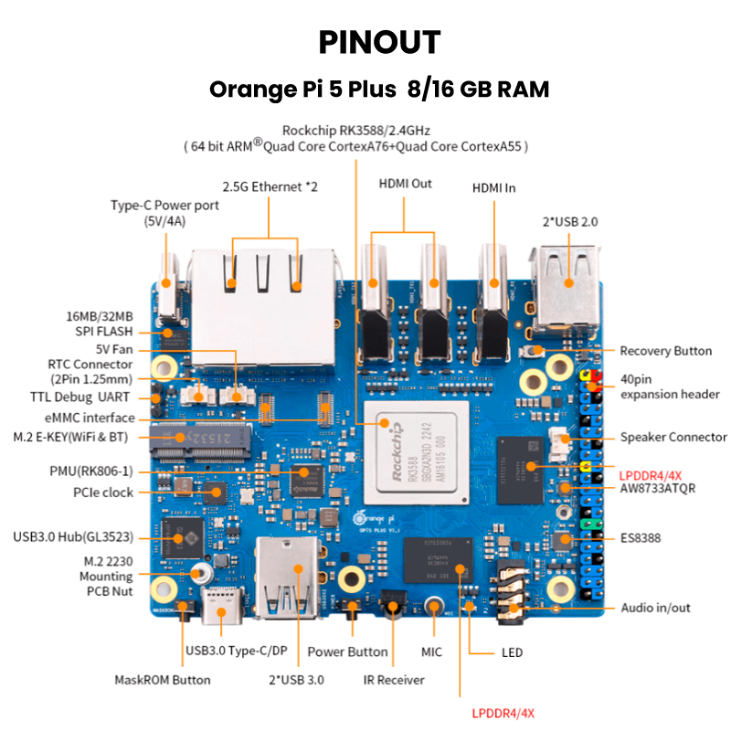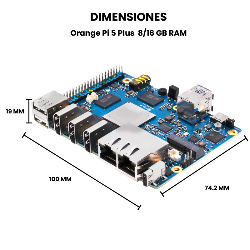 La Orange Pi 5 Plus 8GB/16GB RAM es una placa de desarrollo ultra potente se basa en un diseño de una sola placa y está equipada con un procesador ARM Rockchip RK3588 8-core 64-bit(quad-core A76+quad-core A55), slot para conectar disco de estado solido NVMe, 3 HDMI , puerto tipo C, USB 3.0 y 2.0, puertos de entrada/salida. Esta placa se utiliza principalmente para proyectos de electrónica, robótica, domótica, servidores caseros, entre otros