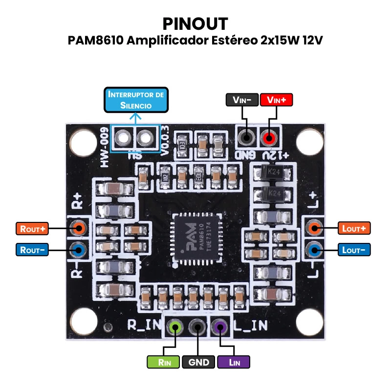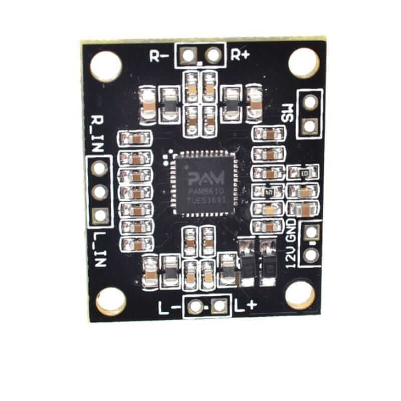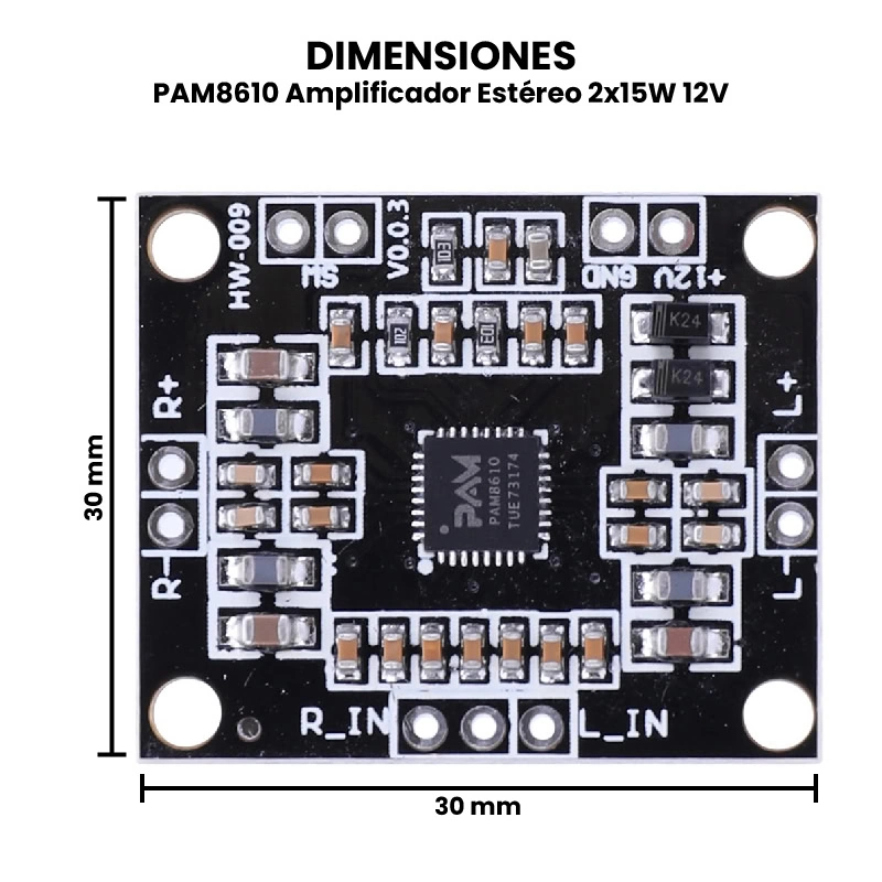 El PAM8610 es un amplificador de audio estéreo clase D que puede entregar hasta 2x15W de potencia a una carga de 8 ohmios, operando con una fuente de alimentación de 7V a 15V DC, siendo 12V la más común. Está basado en el chip PAM8610 de Diodes Incorporated, el cual utiliza modulación por ancho de pulso (PWM) para amplificar señales de audio con alta eficiencia y bajo calor generado, sin necesidad de disipadores grandes. Su funcionamiento consiste en tomar una señal de audio de baja potencia (proveniente de un reproductor, módulo Bluetooth o microcontrolador) y amplificarla lo suficiente para alimentar directamente un par de altavoces estéreo. Además, cuenta con características como bajo nivel de distorsión, buena fidelidad de audio, protección contra sobrecalentamiento y sobrecarga, y generalmente incluye control de volumen.