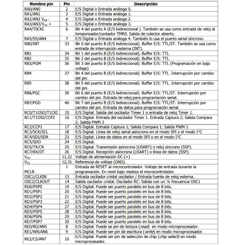 Descripción de los pines del microcontrolador