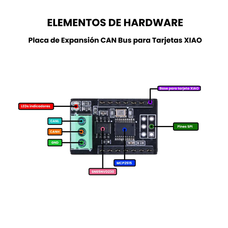La placa de Expansión CAN Bus para Tarjetas XIAO es un shield que contiene el controlador MCP2515 y el transceptor SN65HVD230 empleado para establecer la comunicación mediante el protocolo CAN permitiendo usar la serie de tarjetas de la serie XIAO en ambientes industriales y de alta demanda de sistemas robustos, resistentes al ruido electromagnético.