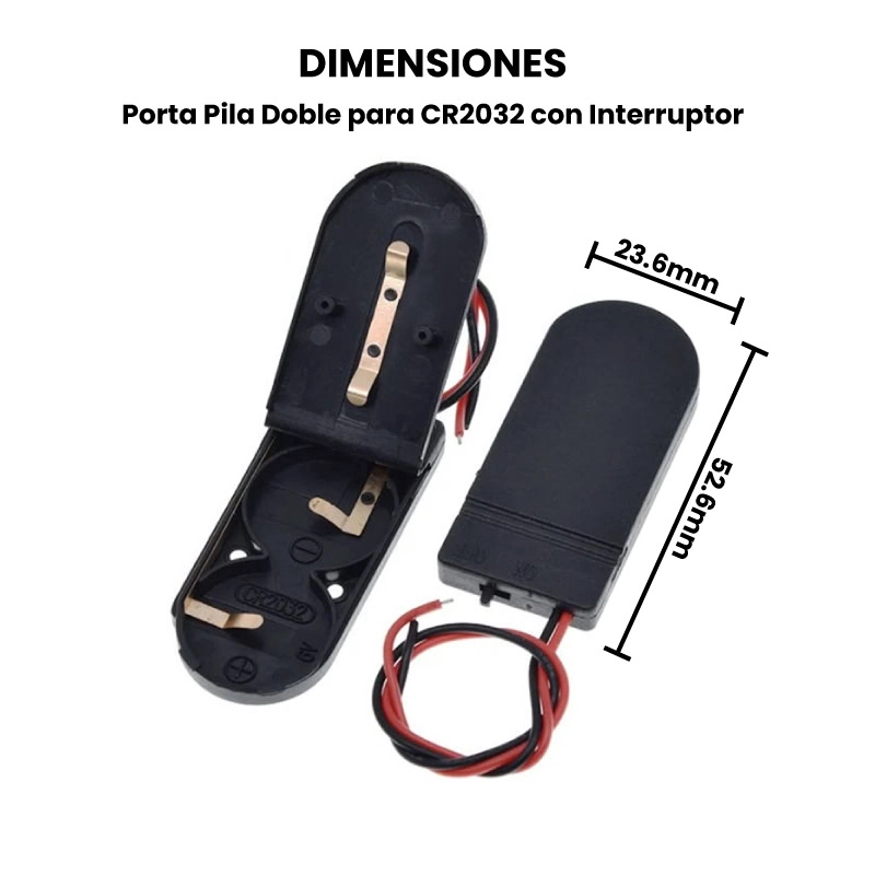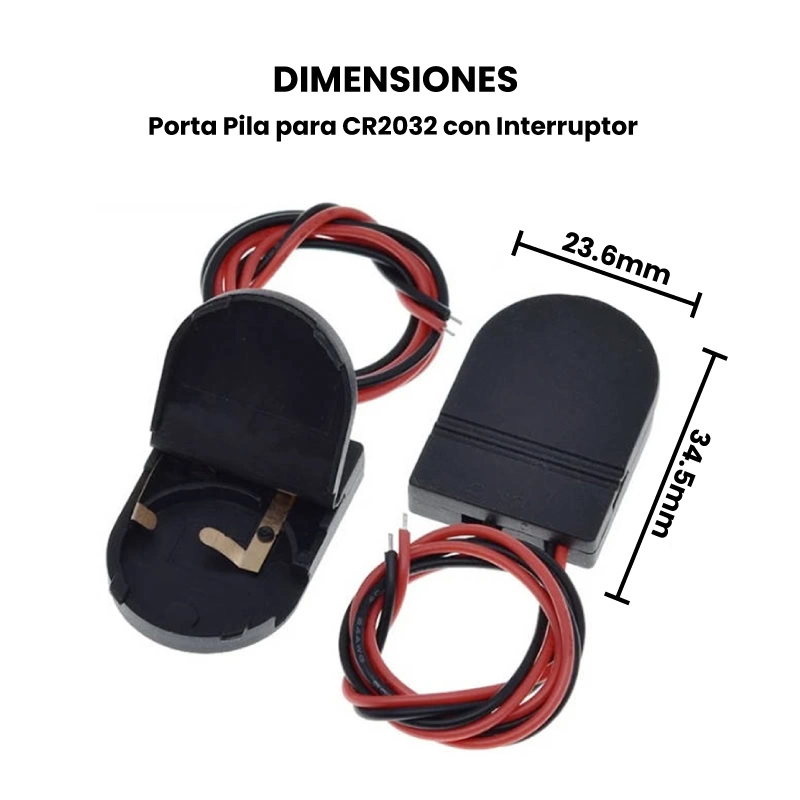 El Porta Pilas para CR2032 con Interruptor es un soporte plástico diseñado para alojar baterías tipo botón CR2032, disponible en versión para una o dos pilas. Cada porta pilas cuenta con cables rojo y negro pre-estañados, listos para conectarse directamente a tus proyectos electrónicos. Además, incorporan un interruptor que permite encender o apagar el circuito sin retirar las pilas.