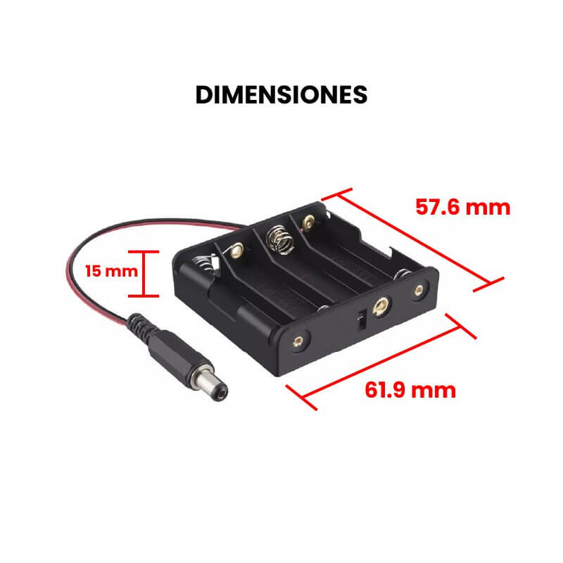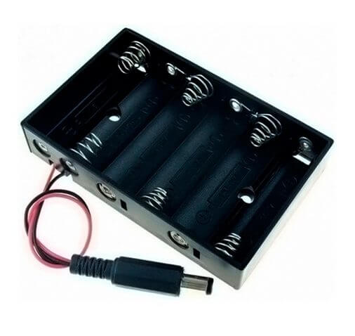 Porta pilas AA con Plug está disponible para 4 y 6 pilas conectadas horizontalmente en serie, te brinda el beneficio de no tener tu proyecto siempre conectado a un eliminador y alimentarlo de forma portátil.