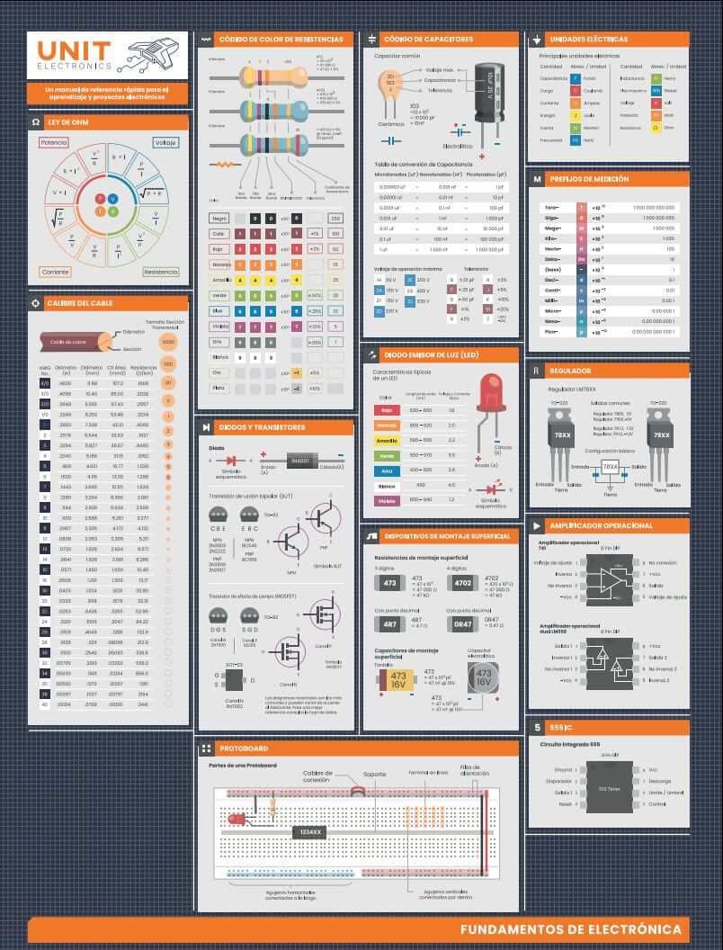 El póster fundamentos de electrónica te permitirá tener un manual de referencia rápida para el aprendizaje de electrónica incluye fórmulas básicas como la ley de ohm, código de colores para resistencias, como leer el valor de capacitores, unidades electrónicas, prefijos de medición, características típicas de voltaje y corriente de leds, referencia de pines de amplificadores operaciones, identificación de resistencias SMD, tamaños y propiedades del cable de cobre.