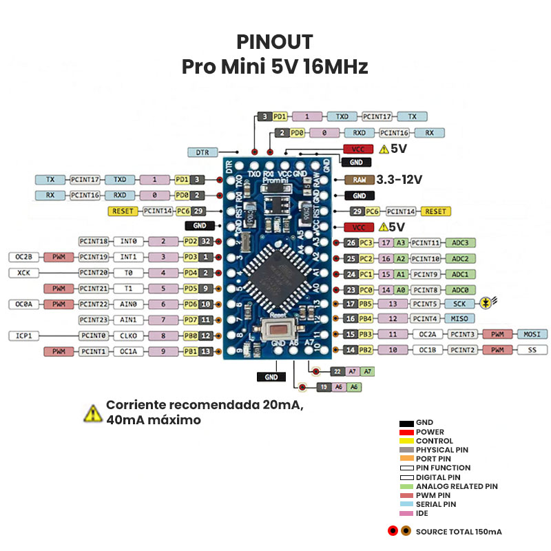 El Pro Mini compatible con Arduino es una tarjeta de desarrollo basada en el ATmega328 con 32 KB de memoria flash, útil en proyectos donde el tamaño sea un factor limitante, por lo demás es tan versátil cómo un Arduino UNO, adquiérelo en su versión de: