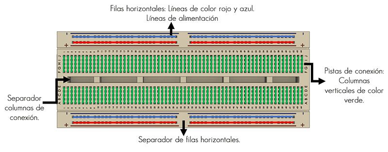 3) Pistas de conexión: La pista se localizan en la parte central del protoboard aquí puedes conectar tu circuito considerando que son columnas verticales de manera lineal.