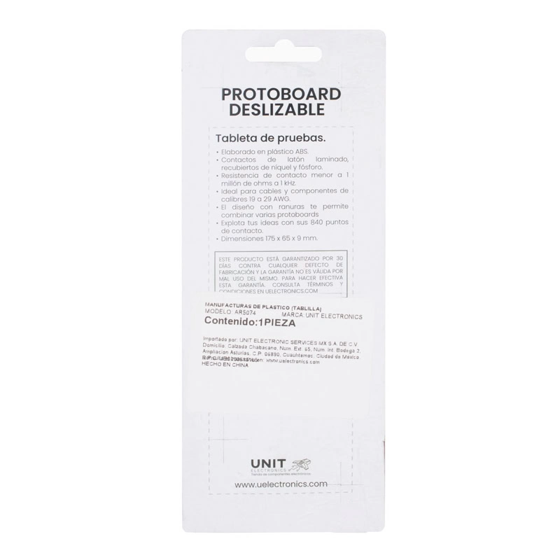Protoboard Deslizable 840 puntos UNIT es útil para facilitar conexiones entre elementos electrónicos, realizar prácticas y simulaciones de circuitos electrónicos.