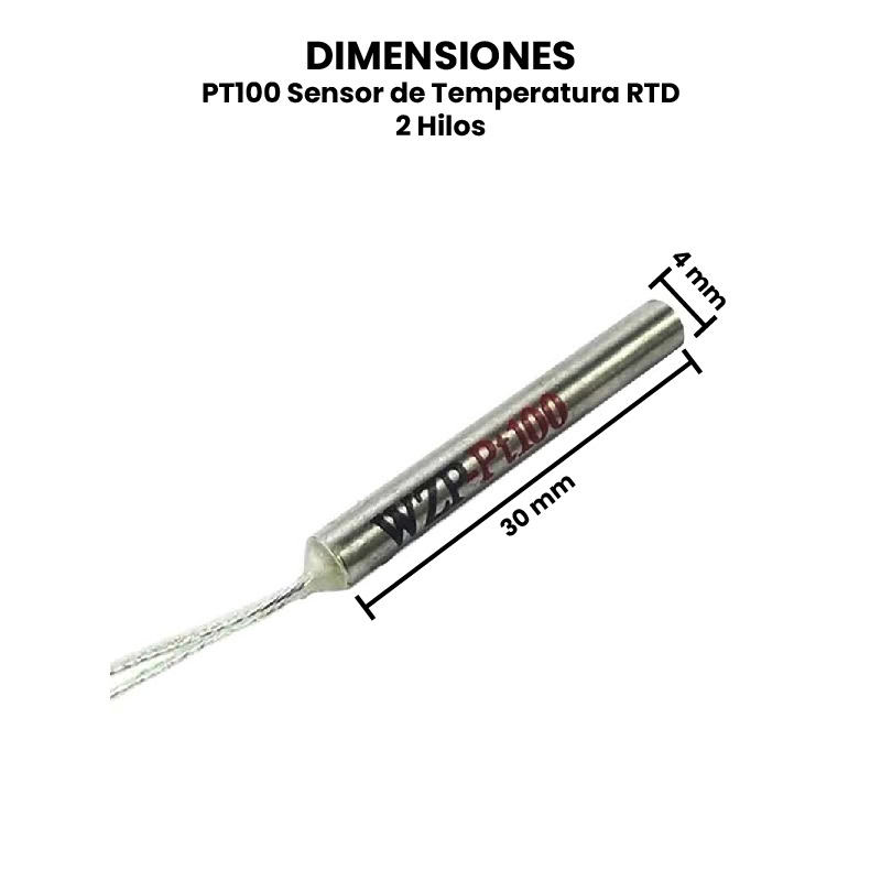 El PT100 de 2 hilos solo tiene dos cables. No hay polaridad, pero la resistencia del cable afecta la lectura, así que es menos preciso que el de 3 o 4 hilos.