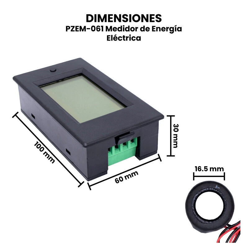 El PZEM-061 Medidor de Energía Eléctrica AC es un instrumento electrónico multifunción diseñado para medir y monitorear parámetros eléctricos en sistemas de corriente alterna monofásica. Incorpora una pantalla LCD retroiluminada que muestra de forma simultánea el voltaje, la corriente, la potencia activa y la energía acumulada. Su funcionamiento se basa en la medición directa del voltaje a través de sus terminales y en la detección de la corriente mediante un transformador de corriente (CT) externo, que proporciona aislamiento y seguridad. A partir de estas mediciones, el microcontrolador interno calcula la potencia y la energía consumida, almacenando los datos incluso cuando se corta la alimentación.