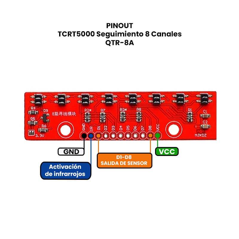 El QTR-8A es un módulo de seguimiento de línea de 8 canales que utiliza sensores infrarrojos (IR) para detectar superficies claras u oscuras, ideal para robots seguidores de línea. Cada sensor emite luz IR y mide la reflexión para determinar la posición de la línea, enviando señales a un microcontrolador (como Arduino) que ajusta el movimiento del robot. Es preciso, configurable y se usa comúnmente en competencias de robótica, automatización y proyectos educativos para enseñar principios de sensado y control.