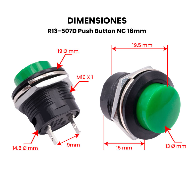 El R13-507D Push Button NC 16 mm es un interruptor de acción momentánea con lógica Normalmente Cerrada (NC). Su diseño está pensado para interrumpir una señal o flujo eléctrico de forma manual.
